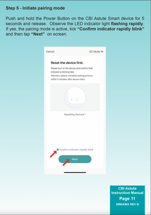 The led will blink rapidly, you are then in pairing mode.  Kindly also ensure that "confirm the indicator is blinking rapidly" is ticked before proceeding to the next step on the CBI Home App during the pairing process.  Refer to the attached.