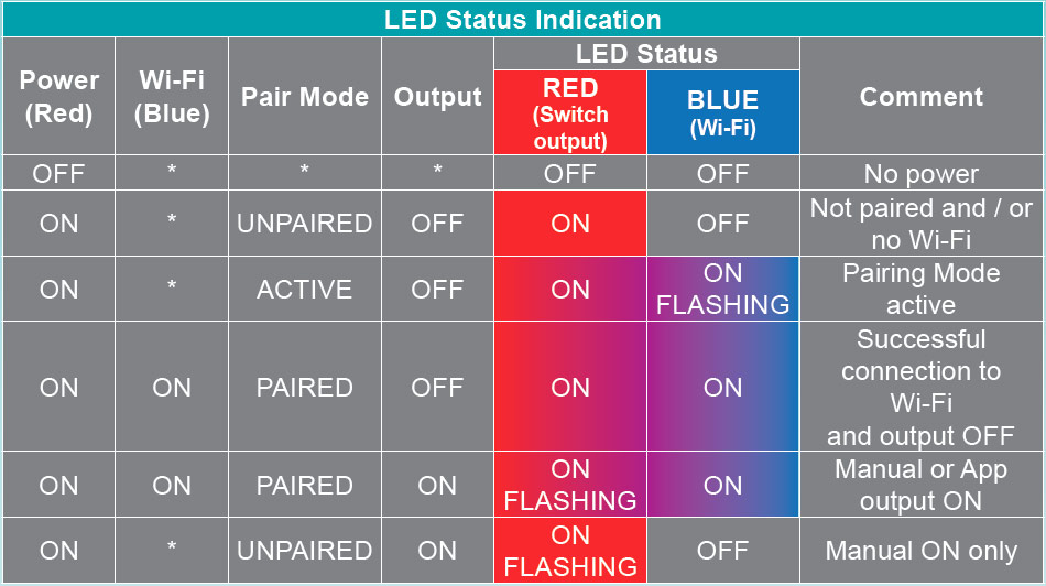 The purple would indicate that the blue and red LED’s are on, therefore it indicates that a successful connection to the Wi-Fi has been established and power to the device is on. Refer to the table for further LED indications.